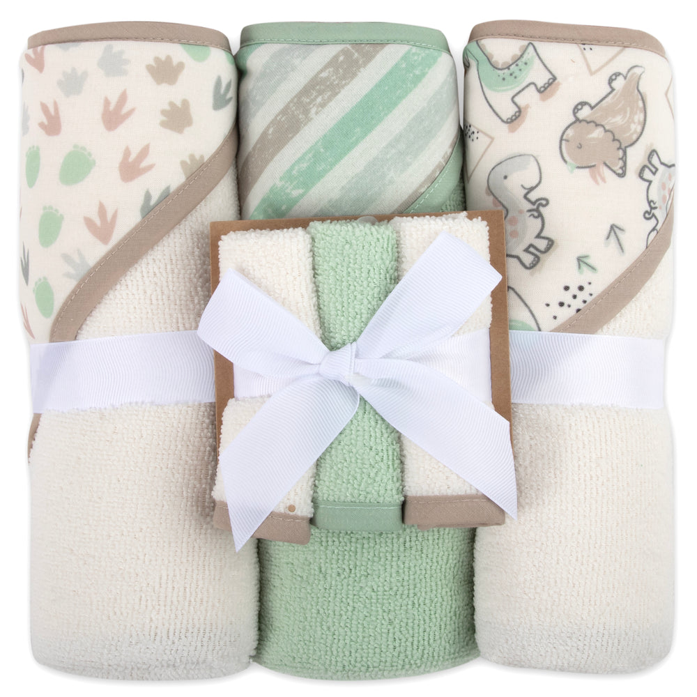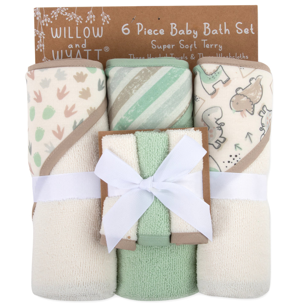 This 6 Piece Dinosaur Themed Hooded Bath Towel & Wash Cloth Baby Bath Set features a luxurious soft terry construction. This makes it perfect for cuddling and snuggling your baby after a warm bath. It makes a great gift and is a perfect addition to any nursery.