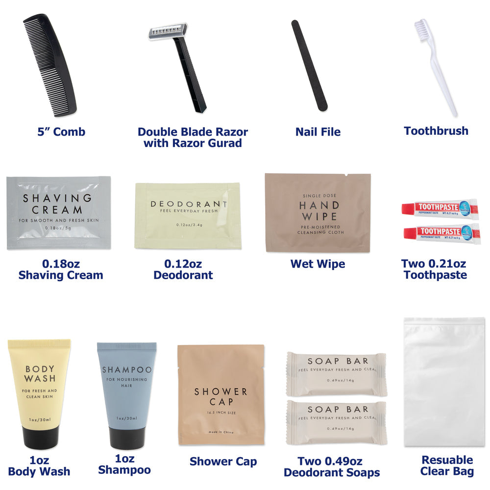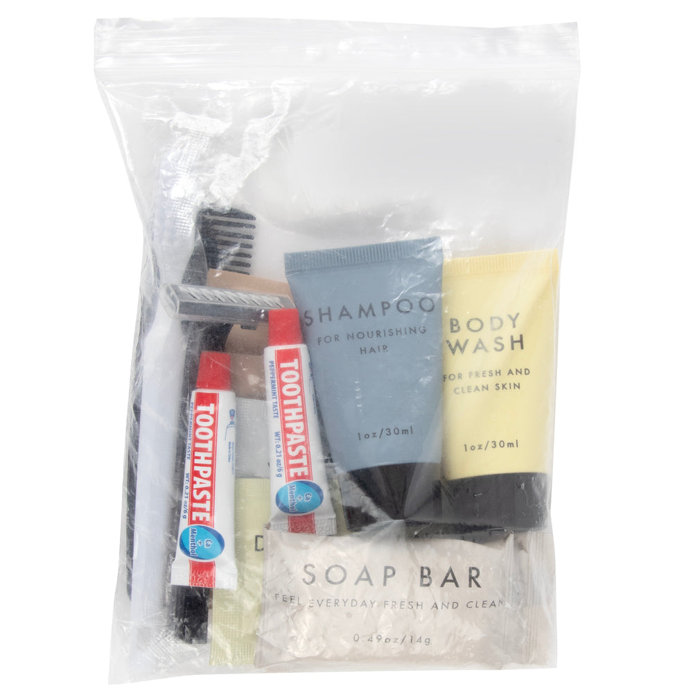 Each basic travel hygiene kit is individually packed with the following supplies: